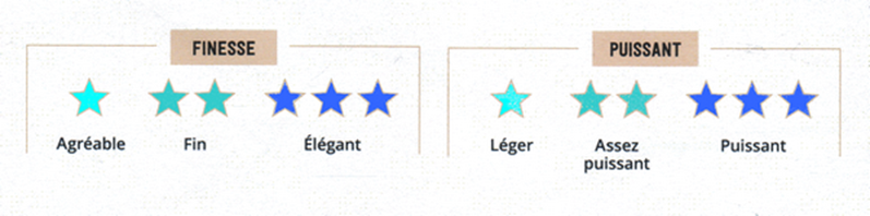 Pour vous aider dans la règle miroir, on peut apprendre à classer les vins et les mets sur 2 critères : Finesse et Puissance. J’attribue des étoiles pour le vin et pour le mets et je compare.