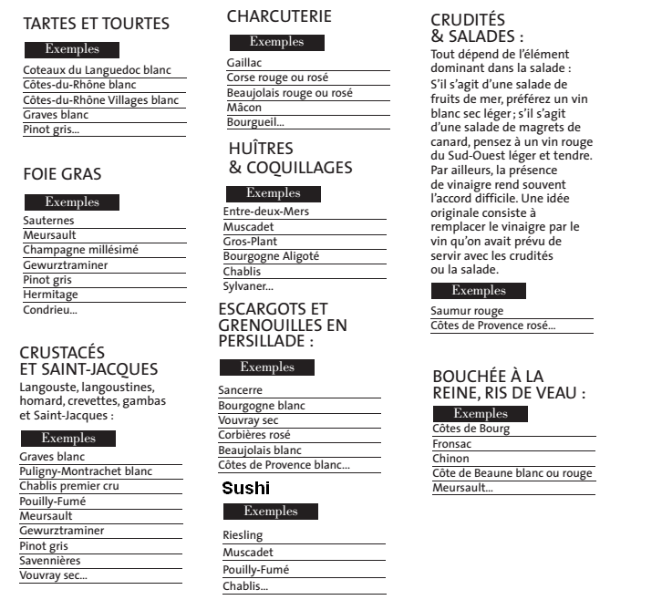 Tartes, tourtes, foie gras, crustacés, saint jacques, charcuterie, huitres, coquillages, escargots, grenouilles, bouchée, ris de veau, salade, sushi